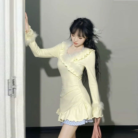 Vestido dulce ceñido V patrocinador con diseño de primavera y otoño, cintura fruncida y efecto esculpido